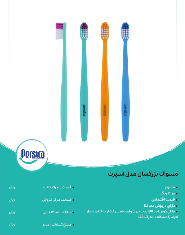 مدیوم در سه رنگ قیمت اقتصادی دارای در پوش محافظ دارای گردن انعطاف پذیر جهت فشار نیاوردن به لثه و دندان افراد یا مشکلات انحراف فکه: مناسب برای استفاده همه افراد