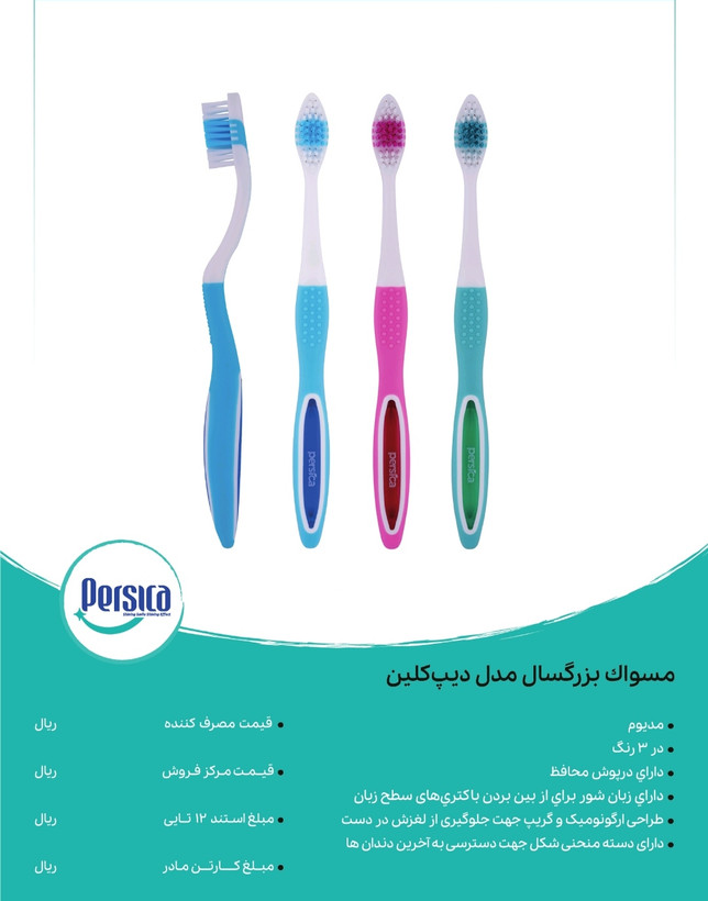 مدیوم در سه رنگ قیمت اقتصادی دارای در پوش محافظ دارای زبان شور جهت از بین بردن باکتری های زبان دارای ارگونومیک و گریب جهت جلوگیری از لغزش در دست دارای دسته منحنی شکل جهت دسترسی به آخرین دندان: مناسب برای استفاده بزرگسالان