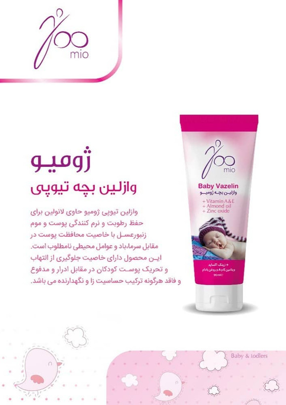 وازلین بچه ژومیو به حجم 90 میلی لیتر ویتامین A. ویتامین E. حاوی روغن بادام حاوی زینک اکساید نرم کننده پوست اطفال حفظ رطوبت پوست اطفال جلوگیری کننده از ادرار سوختگی پای اطفال جلوگیری کننده از التهابات پوستی ایجاد شده در اثر استفاده از پوشک: مناسب برای کودکان و خردسالان